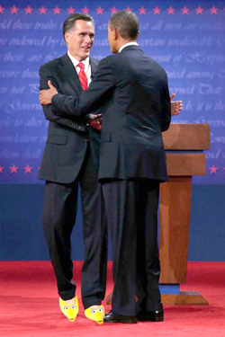 Romney greets Obama in a new pair of shoes....But seriously: The US government appropriates $445 million to the Corporation for Public Broadcasting. During the debate, Romney said, “I love Big Bird.” However, he explained the test he would look at before approving any funding for public television: “Is the program so critical it’s worth borrowing money from China to pay for it?” Romney said.