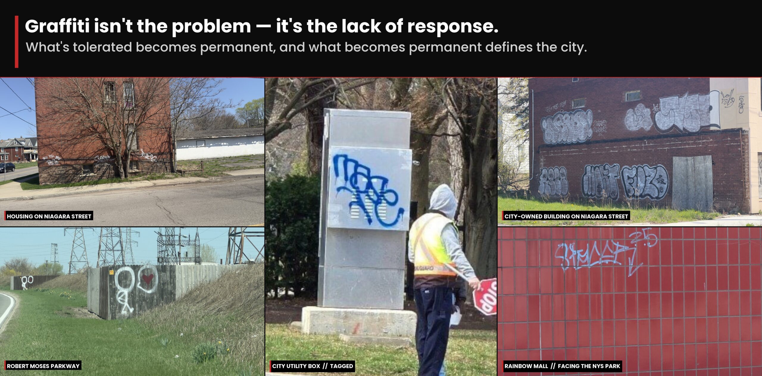 If private property owners can be told to clean graffiti within 10 days, the city should be doing at least that well on its own property. When the city does not act, it promotes the very blight its own ordinance warns about. It sends the wrong message to all, and that is why the mayor’s message on illegal dumping should go one step further. If Niagara Falls is serious about cleanup, then graffiti should be in the same conversation.