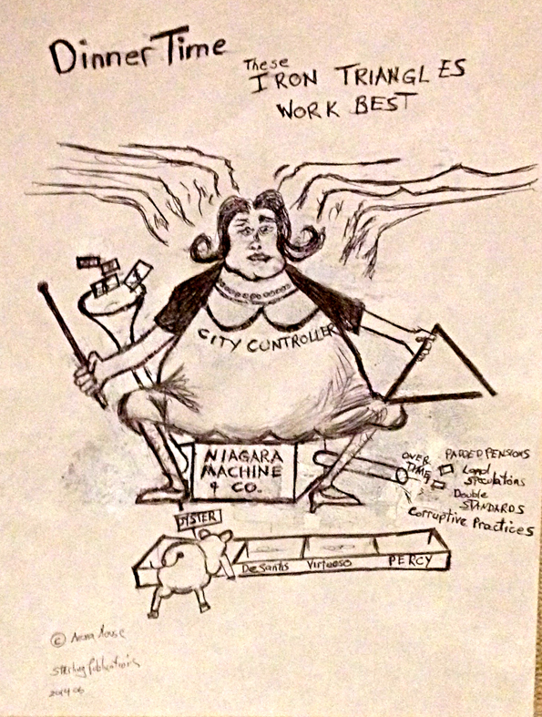 Lately, noted art critics are bending over backwards to review and critique a major new artist's works. The emerging artist is, of course, Gerald Skrlin, who leapt into fame recently when a cartoon of his, lampooning the city controller of Niagara Falls, Maria Brown was considered so offensive that it prompted both the controller, and acting-mayor, Kristen Grandinetti, to attempt to have the cartoon distributor, Sam Fruscione, a former councilman, arrested on the basis that the cartoon was so vile that it rose to the level of criminal harassment.