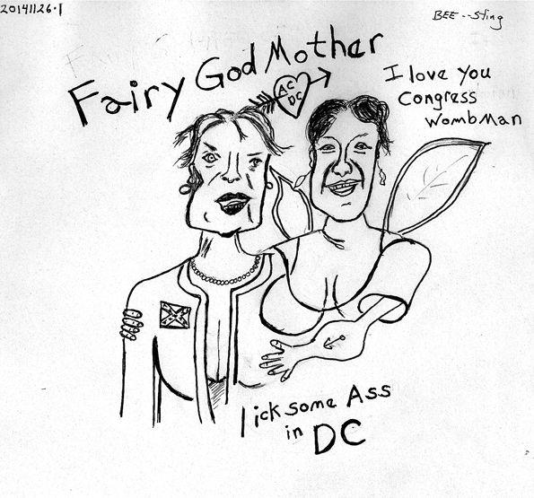 A study in "bi-world" of female companionship and political activism, this piece of work resonates on multiple levels with the realism of the rough and tumble world of politics contrasted with the whimsy of childhood "fairytales" being just two of the more pronounced-nuanced levels. The cartoon presents us with the very mature (elderly) Rep. Louise Slaughter being tightly embraced by younger councilwoman Kristen Grandinetti. The wording of "womb man" is a play on the nature of "womb-manhood" and manhood. In other words politics is a man's game and councilwoman Grandinetti is giving in to this reality in spite of her claims of women being equal to men in the political arena. The erotic embrace, the gentle fairy wings and reduction of the word "kick" to "lick" are all evidentiary that female politics are - in spite of claims to the contrary - more flaccid, sexual and essentially "warm and fuzzy" than male politics.
