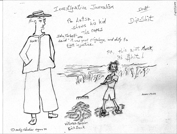Extremely clever and meaningful use of what has been called the "anxious void" in characterizing the abstract expressionism of the fifties…that is, the vast whiteness and empty space that, through its very nothingness, says volumes. In this presentation the investigative reporter (a play on the name of newspaper, the Niagara Falls Reporter) stands alone, a void behind him that represents the "facts" and the "news" that he is working to dig into and reveal to his readers. That whiteness is the blank page of newsprint that will fill and resolve itself with critical information once the muckraker(s) have done their jobs…in this case a father and son work as a muckraking team. At the bottom of the work lies a reference to Niagara Falls Mayor Paul A.