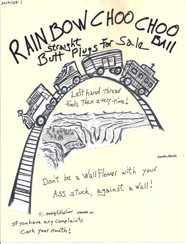 This work confounds and amuses simultaneously. The reference to left handed thread and butt plugs leaves little to the imagination especially when positioned beneath the "rainbow" that can be seen as the multi colored "freak flag" (think of David Crosby singing "I feel like letting my freak flag fly!" in his song "I almost cut my hair") of sexual equality. This theme plays nicely off the artist's portrayal of the collective consciousness rainbow image.