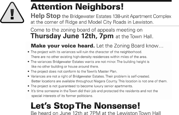 LEWISTON, NY: A crucial day is approaching for the high-density Bridgewater apartment building project, planned to be built on Rt. 104, near Model City Rd.