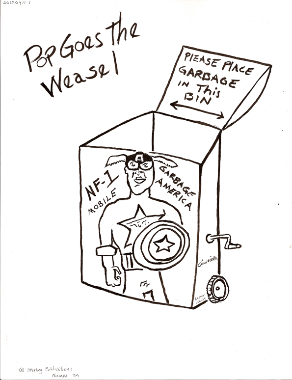 For the past year the Dyster administration's trash and recycling plan has been the talk of the town. And how unpleasant and painful that talk has been. With an ill informed council and a trash contract bid procedure straight from the bowels of the deepest and darkest recesses of Paul Dyster's city hall, the residents don't know if they're coming or going let alone properly throwing their trash and recyclables. It was only a matter of time until Dyster and Gang fell victim to the rapier-like cartoon pen of Gerald Skrlin. Just as the lid pops on a classic Jack in the Box child's toy the lid on the trash tote has popped to reveal more than just a tote to be filled. It reveals a trash and recycling program rooted in contradiction, incomprehensible regulations and costly expenditures. Yes, the weasel has indeed "popped" with a super hero of a mayor at the helm of a very leaky bureaucracy, a veritable Captain Trash: Paul Dyster. While critics justifiably make the case that the mayor is not only not a super hero, but rather the villain in a badly conceived scenario. And so it will be up to the voter to decide if the mayor's political career ends in a dumpster.